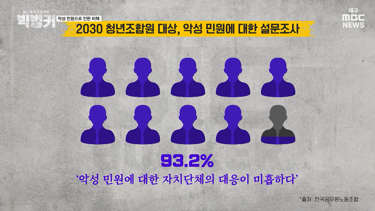 추승진 전국공무원노동조합 부산지역본부 정책부장 "2022년에는 고용노동부 모 지청 소속 신입 근로감독관이 극단적 선택을 했는데요, 동료들의 증언에 따르면 민원인이 악의적으로 반복적인 민원을 제기하고 결국 민원인과의 송사 문제로 번지면서 심적 부담감으로 끝내 안타까운 선택을 했었어요. 이런 사례들이 매년 전국에서 벌어지고 있습니다"