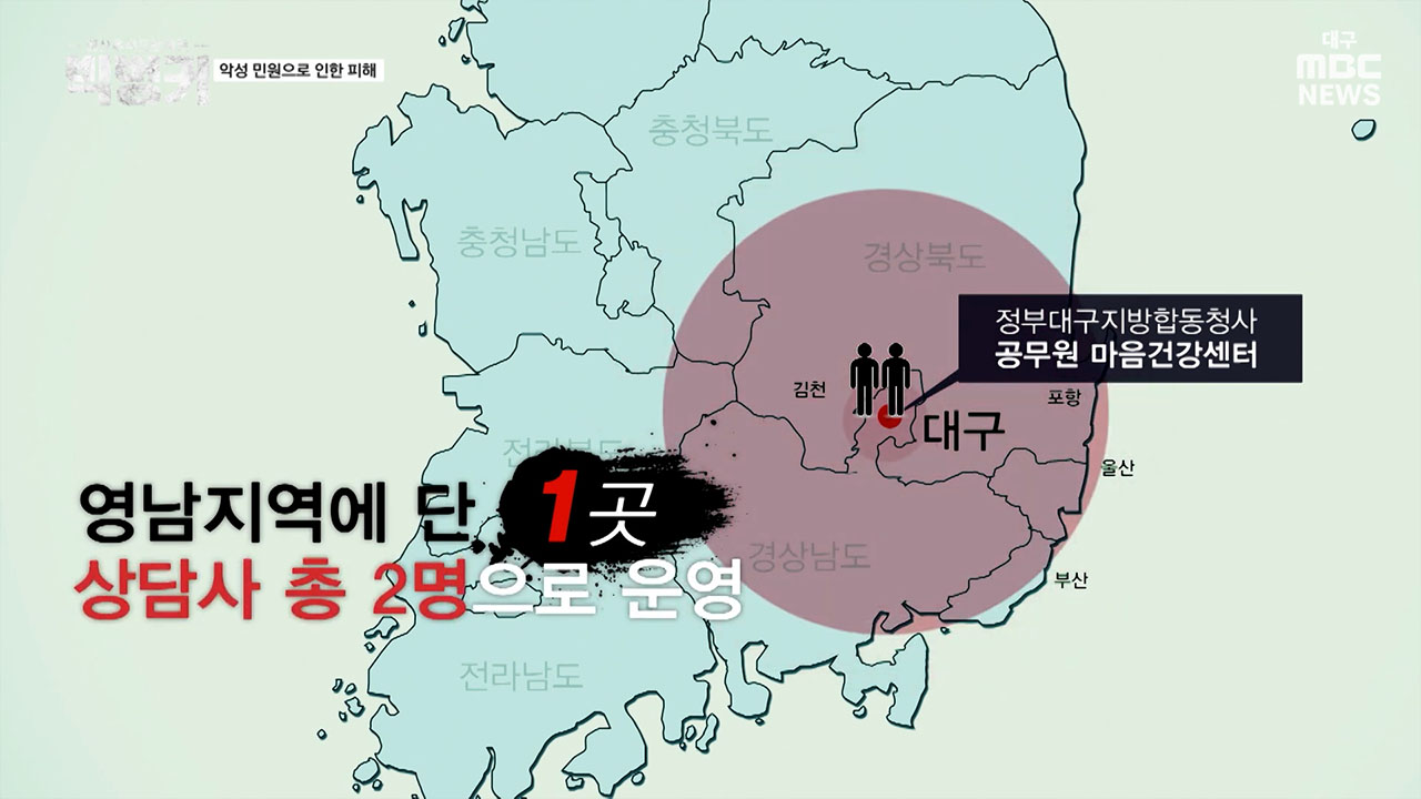 추승진 전국공무원노동조합 부산지역본부 정책부장 "문제는 또 있습니다. 실제 공무원들의 심리 상담은 공무원 마음건강센터에서 가능합니다. 공무원과 그 가족을 대상으로 대면, 온라인, 전화 상담을 받을 수 있는 곳인데요, 우리 지역에서는 영남권 마음건강센터가 대구에 있습니다. 문제는 이 한 곳에서 대구·경북과 부산·경남을 모두 커버하고 있는데 담당자가 2명이라는 거죠. 2명이 대구·경북과 부산·경남의 모두를 담당하고 있으니 이게 제대로 된 상담이 가능할까 싶은 거죠. 거기다 이렇게 악성 민원에 대한 실비 지원도 지자체마다 다르니까 본인이 어디에 근무하느냐에 따라 지원을 받을 수도 있고 못 받을 수도 있는 거죠"