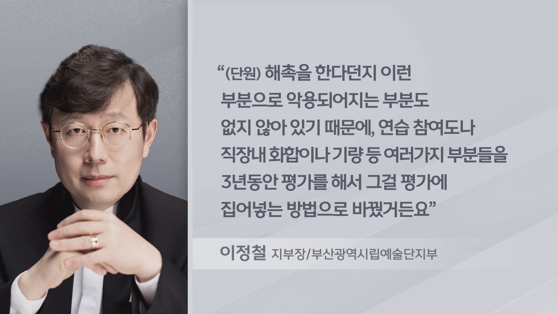 "(단원) 해촉을 한다든지 이런 부분으로 악용되는 부분도 없지 않아 있기 때문에, 연습 참여도나 직장 내 화합이나 기량 등 여러 가지 부분들을 3년 동안 평가를 해서 그걸 평가에 집어넣는 방법으로 바꿨거든요"