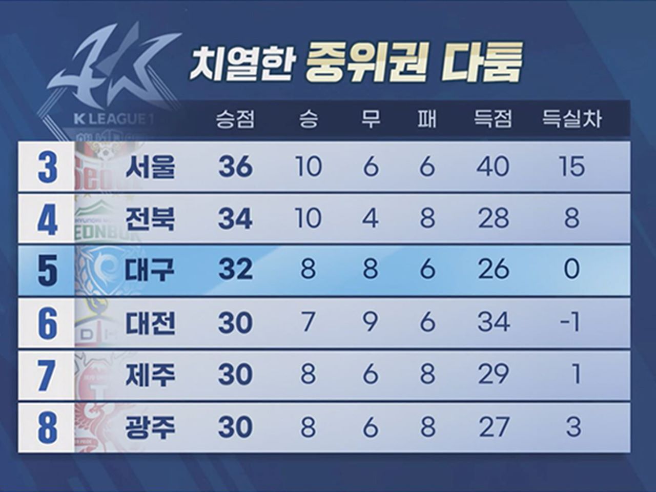 6위부터 8위까지 자리한 대전-제주-광주가 승점 2점 차로 바짝 뒤를 쫓고 있는데요.