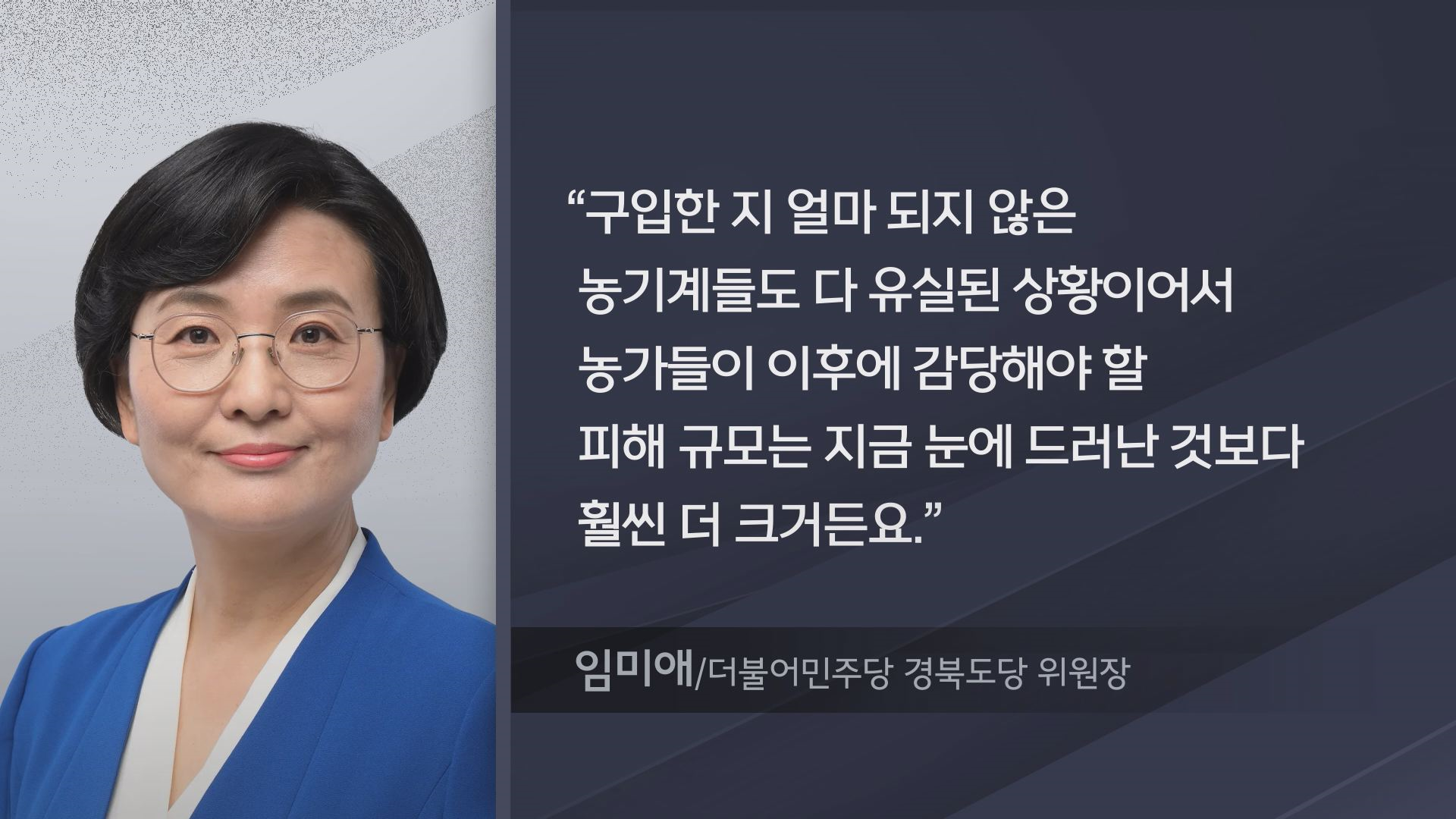 "구입한 지 얼마 되지 않은 농기계들도 다 유실된 상황이어서 농가들이 이후에 감당해야 할 피해 규모는 지금 눈에 드러난 것보다 훨씬 더 크거든요. 당 차원에서 대책을 좀 마련해 달라는 요구를 지속적으로 할 계획입니다.