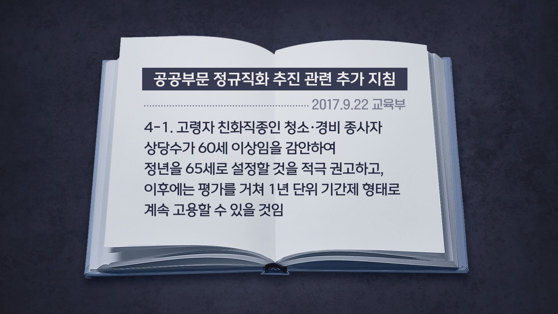 교육부가 2017년 당직 경비원 등의 정년을 65세로 정하고 평가를 거쳐 1년 단위로 연장할 수 있도록 권고하는 지침을 마련했는데요.
