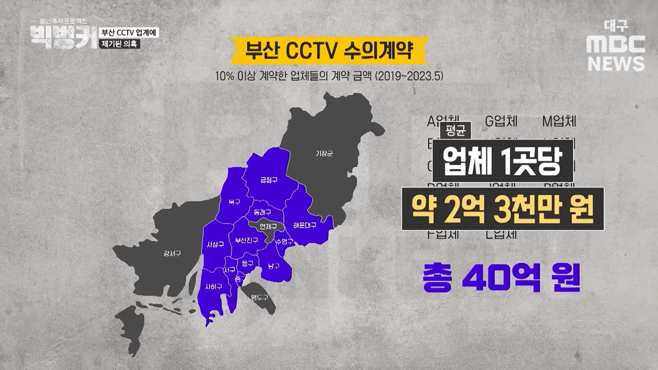 조재형 부산MBC 기자 "부산시 16개 구·군 전체의 CCTV 수의계약 사업을 조사해 봤더니 이 중에서 의혹을 받는 이 업체의 계약 비율이 가장 높은 지역이 부산 서구였어요. 그래서 수의계약한 거 말고도 한번 봐야겠다 싶어서 조사해 봤는데, '마스'로 한국감시기기공업동조합이 체결한 게 7건이었어요. 여기서 더 봐야 하는 게 '이 조합의 물품 공급업체가 어딘가'이거든요? 부산·울산·경남권에 있는 업체 중에서 이 조합의 공급업체로 선정된 건 이 업체 단 한 곳이었습니다. 그러니까 7건의 조달계약이 다 이 업체에서 공급한다는 이야기인데, 이러면 몰아주기 의혹이 생기더라고요? 과연 담당 공무원은 몰랐을까요? 물건을 사거나 계약을 하면 물품 공급업체를 모를 수가 없잖아요? 부산 서구청의 CCTV 사업 수의계약의 17%를 이 업체가 했습니다. 그리고 2019년부터 2022년까지 13건의 CCTV 관련 사업 중 7건을 한국감시기기공업협동조합과 계약했고, 공급업체는 바로 이 업체입니다. 서구청 CCTV 사업에서 이 업체가 차지하는 비중이 너무 크다는 생각이 저절로 들지 않나요?"