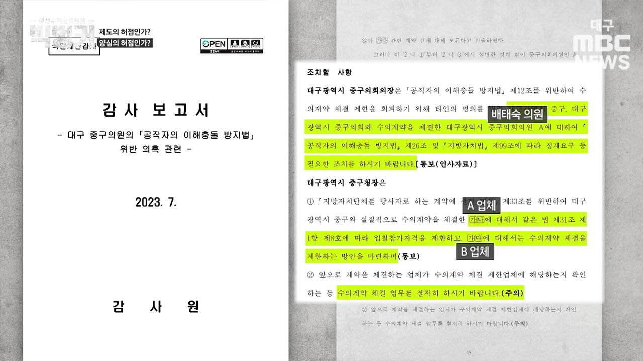 하지만 B 업체가 납품한 물건에는 여전히 A 업체의 로고가 붙어 있고, 계약서 서명란에 찍힌 도장에 나온 이름은 배태숙 의원과 A 업체를 운영하는 동업자 이름과 같다고 합니다. 현직 의원이 차명회사를 차려서 본인 지역구의 일을 따냈다는 의혹에 대해 대구 중구청에서 감사를 진행하고 있습니다.