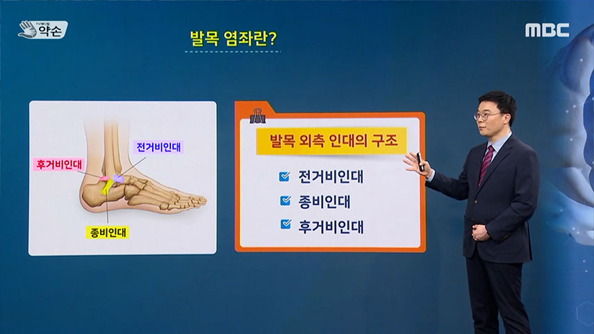 맞습니다. 보통 발목을 삐었다고 이야기를 많이 하시죠. 발목을 삘 때 발이 돌아가는 걸 염좌라고 이야기합니다. 발목 외측에는 크게 세 가지 중요한 인대 구조물이 있습니다. 먼저 앞쪽에서 거골과 비골을 연결하는 전거비인대. 그리고 종골과 비골을 연결하는 종비인대. 뒤쪽에서 거골과 비골을 연결하는 후거비인대. 이렇게 세 개의 인대 구조물로 나눠질 수 있고 우리가 발목을 접질리면 가장 먼저 손상을 받는 게 전거비인대가 가장 먼저 손상을 받게 됩니다.