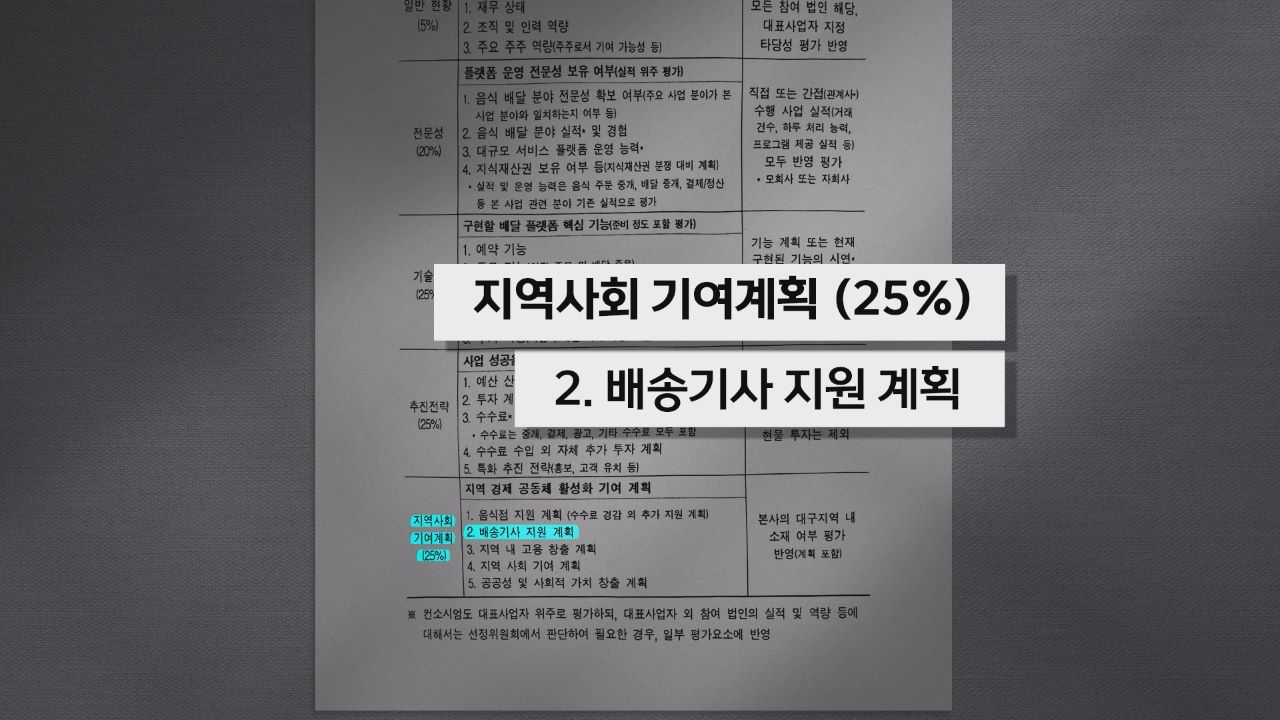 특히 평가지표 가운데 배달 대행 플랫폼 국내 1위 운영사를 자회사로 둔 인성데이타에 유리한 '배송 기사 지원 계획' 등이 포함돼 의혹이 더욱 커지고 있습니다.