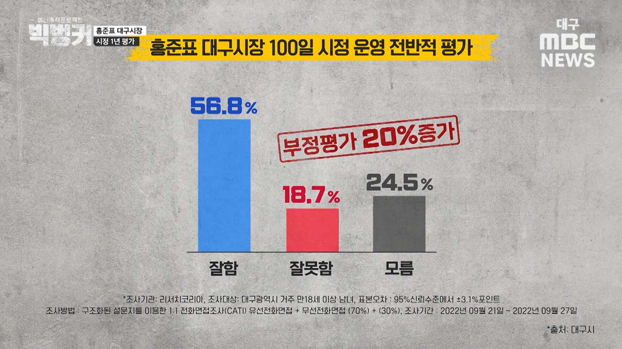 2022년 9월 21일~27일, 리서치코리아, 만 18세 이상 대구시민 1,009명, 전화 면접, 표본오차 95%, 신뢰 수준 신뢰 수준 ±3.1%포인트