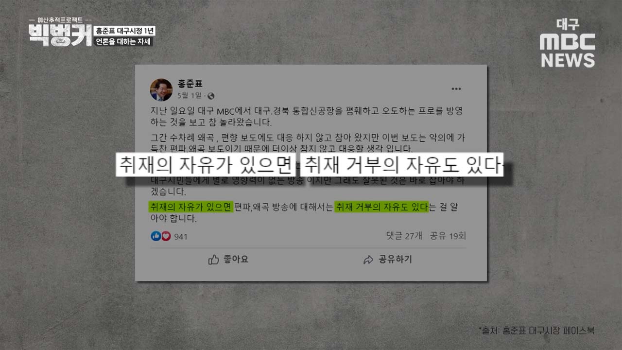이 모든 정책 변화 앞에 붙는 말이 '소통 없이'라는 단어인데요, 이를 단적으로 보여 주는 게 대구시가 대구MBC의 취재를 전면 거부하고 있는 부분입니다. 지난 4월 30일 대구MBC는 '시사톡톡'이라는 프로그램에서 대구경북신공항 특별법의 문제점을 지적하는 내용을 방송했는데요, 이에 대해 홍준표 시장은 대구MBC가 악의에 찬 편파, 왜곡 보도를 한다면 이후 대구MBC의 취재를 거부하고 시청에 대한 출입 금지뿐만 아니라 명예훼손으로 대구MBC 보도국장과 진행자, 담당 기자, 출연자를 고소했습니다.
