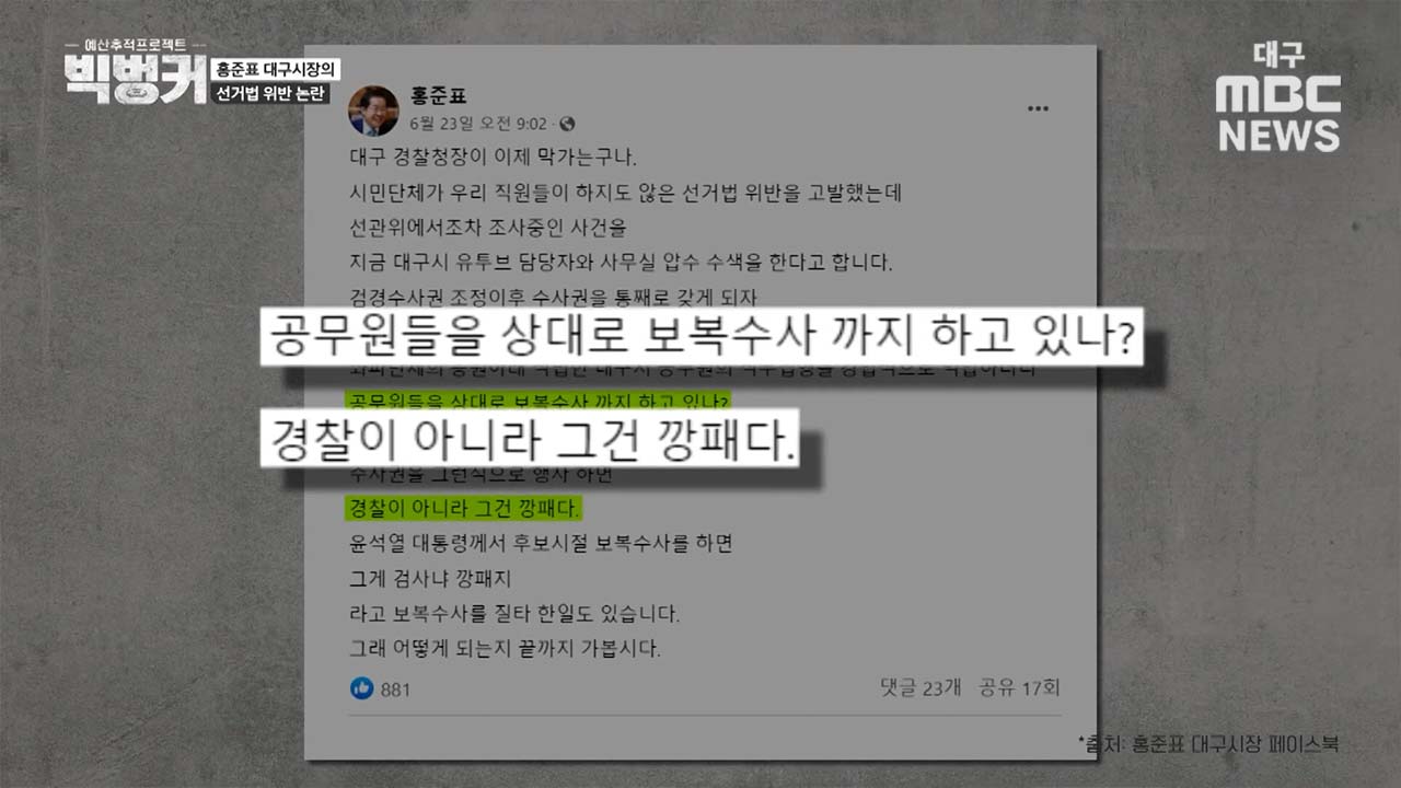 참여연대는 홍준표 시장 같은 경우에는 대구시 유튜브와 홍준표 시장 유튜브로 알려져 있는 홍카콜라TV, 이 두 가지 관련해서 고발했는데요, 대구시 유튜브의 경우에는 2022년부터 꾸준히 문제를 제기해 왔지만 홍준표 시장이 이런 담당 공무원의 행동을 방조했다는 점, 홍카콜라TV의 경우에는 개인 소셜미디어에 너무 지속해 자신의 업적을 홍보하고 있는 상황이 있었기 때문에 공직선거법 위반으로 고발하게 됐다고 밝혔습니다.