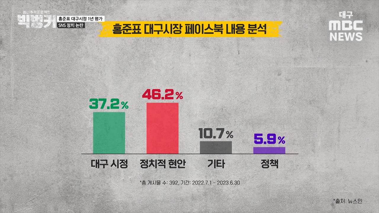 대구시 공무원들도 홍 시장의 의견을 SNS로 본다는 얘기가 돌고 있습니다. SNS 내용을 보면 몸은 대구에 있는데 마음은 서울에 있는 거 아니냐는 반응들이 많은데요, 뉴스민에서 홍준표 시장의 페이스북에 대한 분석을 한 적이 있습니다.