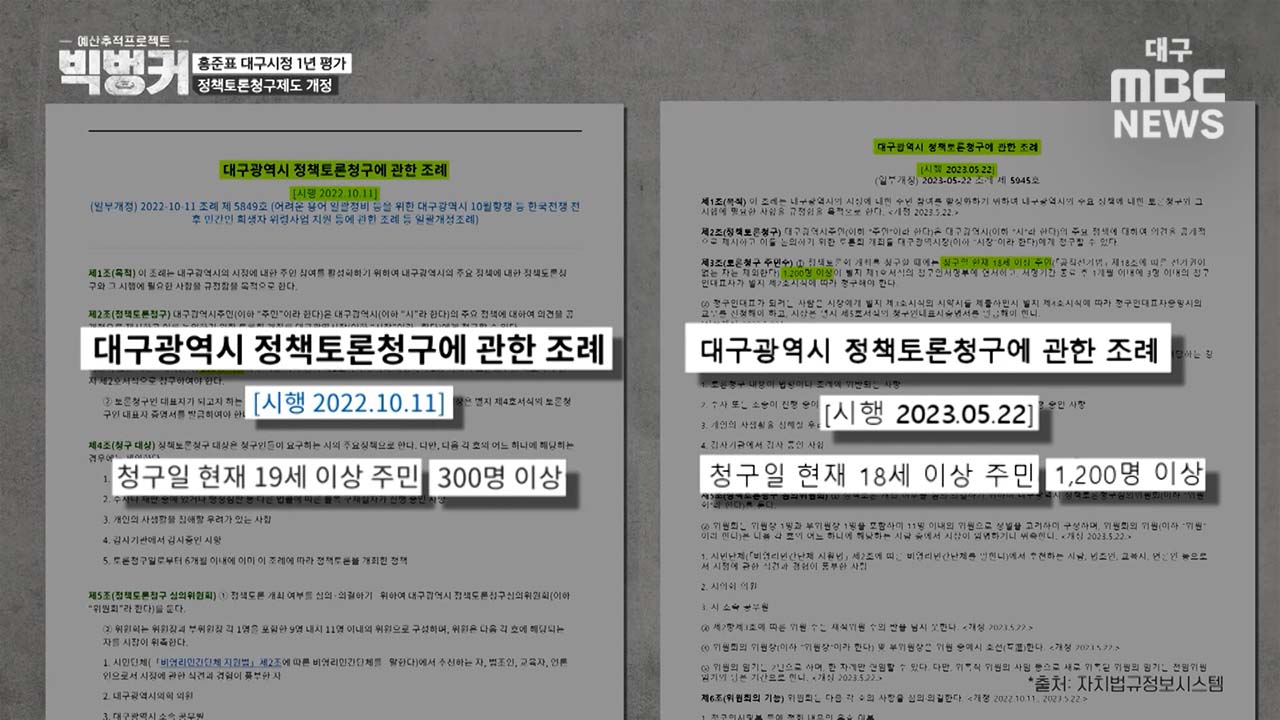 천용길 뉴스민 기자 "대구시는 조례 개정 사유에 대해 타지역 대비해 인구 대비 청구 인원의 적절성을 따져 조례 개정을 검토했고, 토론 청구 가능 연령이 19세에서 18세로 낮아지고, 행정구역 조정으로 경북 군위군이 대구로 편입되면서 인구도 늘어나기 때문에 토론회 청구인 수를 합리적인 수준으로 바꾼 것이라고 밝혔는데요, 사실 군위군의 인구는 2만 3,186명으로 대구시 인구가 엄청나게 늘어나는 것도 아니에요. 전체 인구의 약 1% 정도 늘어나는 건데, 합리적이라기보다 정책토론 청구의 장벽을 높였다고 보는 입장이 훨씬 많은 편입니다.