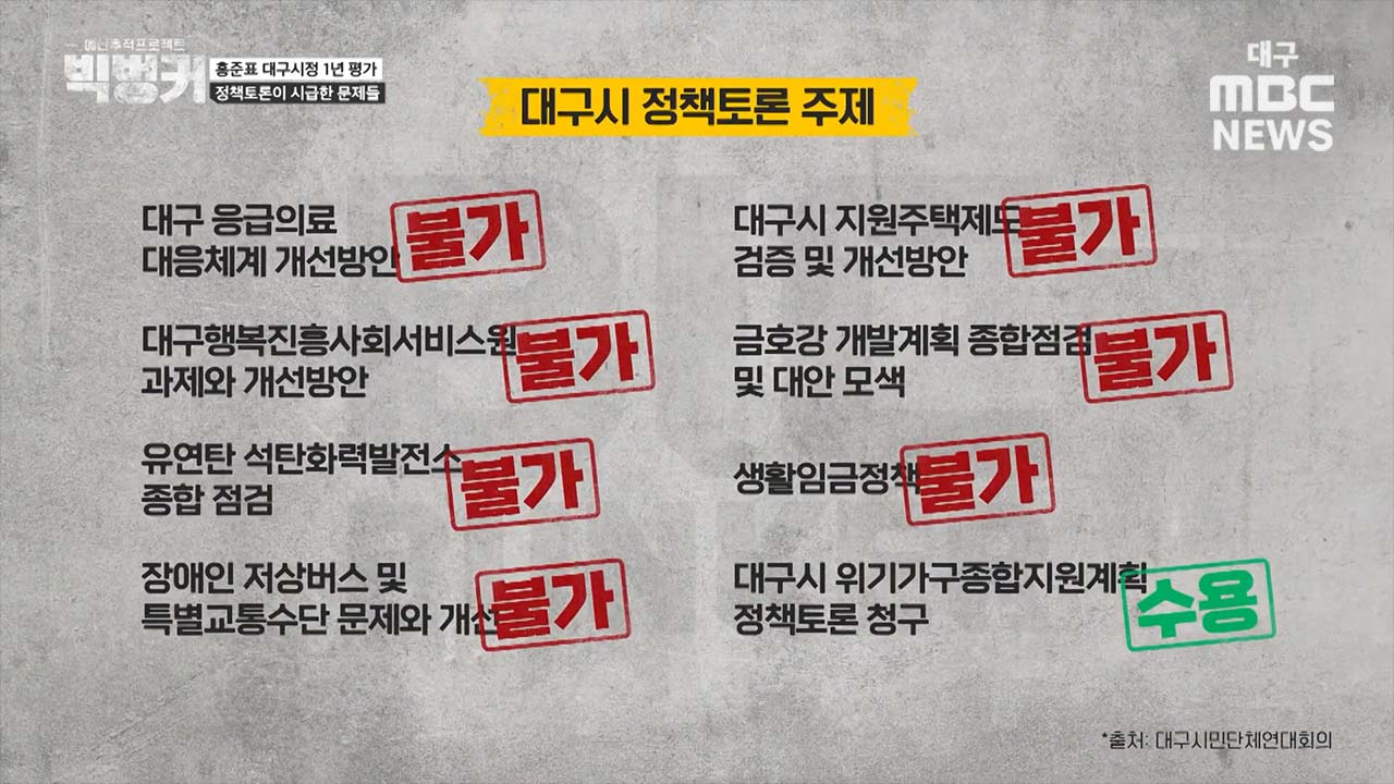 천용길 뉴스민 기자 "하나하나 시급한 문제들인데요, 그런데 시민단체가 제안했던 정책토론 8개 중 7개가 대구시로부터 불가 통보를 받았습니다. 토론 불가 결정을 한 근거로 심의위원회 심의 결과라고만 밝힐 뿐 구체적인 사유는 밝히지 않았는데요, '대구광역시 정책토론 청구에 관한 조례'를 보면 제6조 제3호에 심의위원회가 정책토론회 개최 여부를 정할 수 있게 되어 있습니다. 과반수 찬성으로 의결을 할 수 있는데요, 법적 근거만 대구 이유를 밝히지 않는 건 무책임한 태도 아닐까요? 대구시가 정책토론이 가능하다고 밝힌 내용은 위기가구 종합지원 정책 토론 단 1건이었습니다"