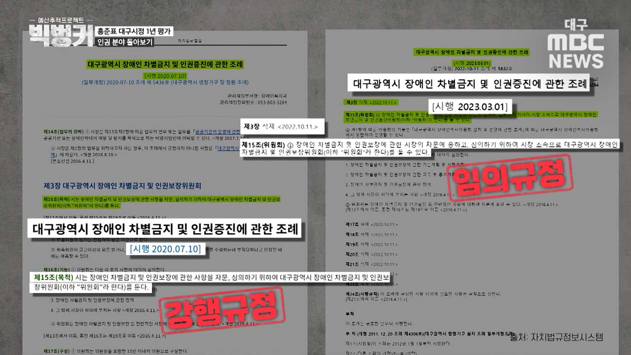 그런데 민선 8기에 들어서면서 '대구광역시 장애인 차별금지 및 인권 증진에 관한 조례'의 장애인 차별금지 및 인권 보장위원회 설치 강행 규정을 임의 규정으로 변경하고, 장애인복지위원회에서 통합 운영할 수 있도록 개정함으로써 사실상 장애인 차별금지 및 인권 보장위원회를 폐지했습니다.