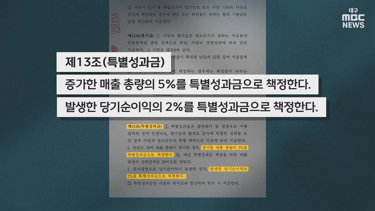 박진우 사장은 1999년에 40대 당시로는 아주 젊은 나이로 신협중앙회장이 됐고 연임도 했지만 개인 비리와 부실 경영으로 물러났습니다. 그 이후에는 횡령 등의 문제로 처벌을 받았지만 2008년 사면으로 특별복권됐습니다. 김관용 경북도지사시절에 여러 자리를 역임하다 2021년 경북신용보증재단 이사장 시절 인사전횡 논란으로 직무정지를 당했습니다. 청도군과 특혜성 계약서를 쓴 것은 계약서 제13조 특별성과금입니다. 공사에 특별한 성과를 내면 사장과 청도군수의 특별계약에 따라 지급한다고 명시했습니다. 이전 계약서는 없는 내용인데 특별한 성과를 내면 성과금을 가져가는데, 성과는 전년 대비 매출 총량을 평가하는 것으로 했습니다. 총량이 늘면 증가한 액수의 5%를 성과금으로 챙깁니다. 여기에다 또 다른 특별 성과금이 있습니다. 당기순이익을 내면 순익의 2%를 받는다는 겁니다. 박진우 사장이 경영할 대구신용보증재단은 소상공인과 소기업을 지원하는 기관입니다.