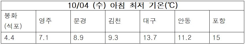 수요일 아침 대구의 기온은 13.7도, 안동은 11.2도, 포항은 15도로 시작했고요.