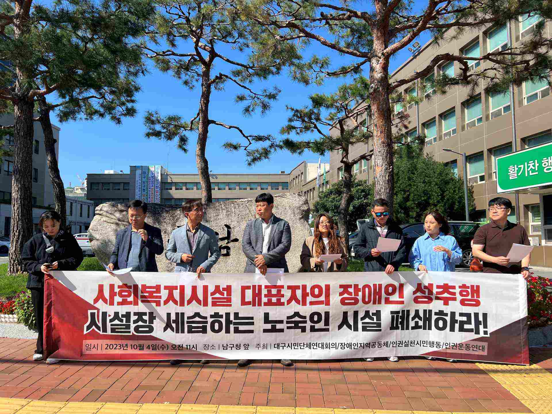 대구시민단체연대회의 등 3개 시민단체는 10월 4일 대구 남구청 앞에서 기자회견을 열고 "장애인을 성추행한 노숙인 시설 대표가 아들에게 대표 자리를 세습했다"며 시설 폐쇄를 요구했습니다.