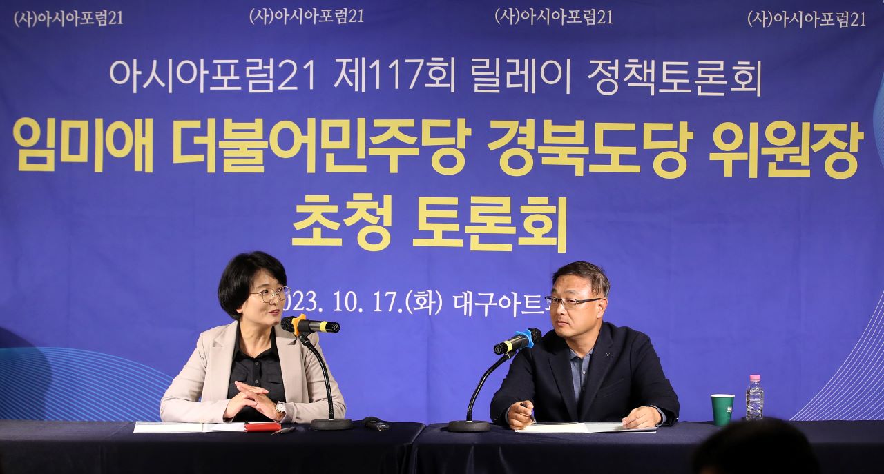 임 위원장은 17일 아시아포럼21 제117회 릴레이 정책토론회에서 "민주당이 젊은이들 사이 비호감도가 높다는 점을 개선하기 위해서는 당 대표의 헌신이 필요하다"면서 "'경북이라는 험지에 이 대표가 출마하는 것은 어떻겠냐?'고 최근 민주당 중진 의원들에게 건의했다"고 말했습니다.