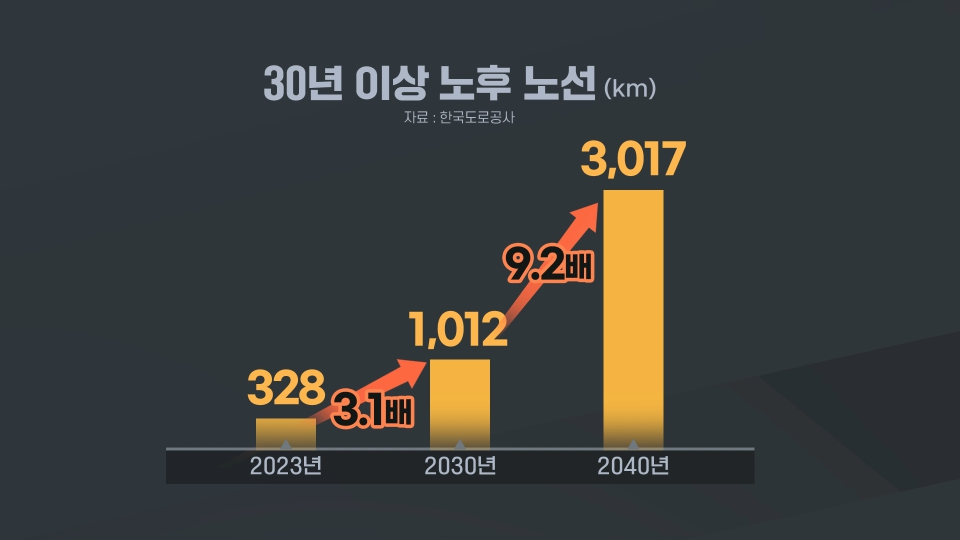 30년이 넘은 고속도로 교량과 같은 구조물도 현재 800여 곳에서 2040년에는 7천9백여 개로 9.5배 증가합니다.