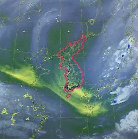 컬러 수증기 사진에서 현재 우리나라 고도 약 5km 부근에는 노란색으로 표현된 차고 건조한 공기가 자리 잡고 있는데요.