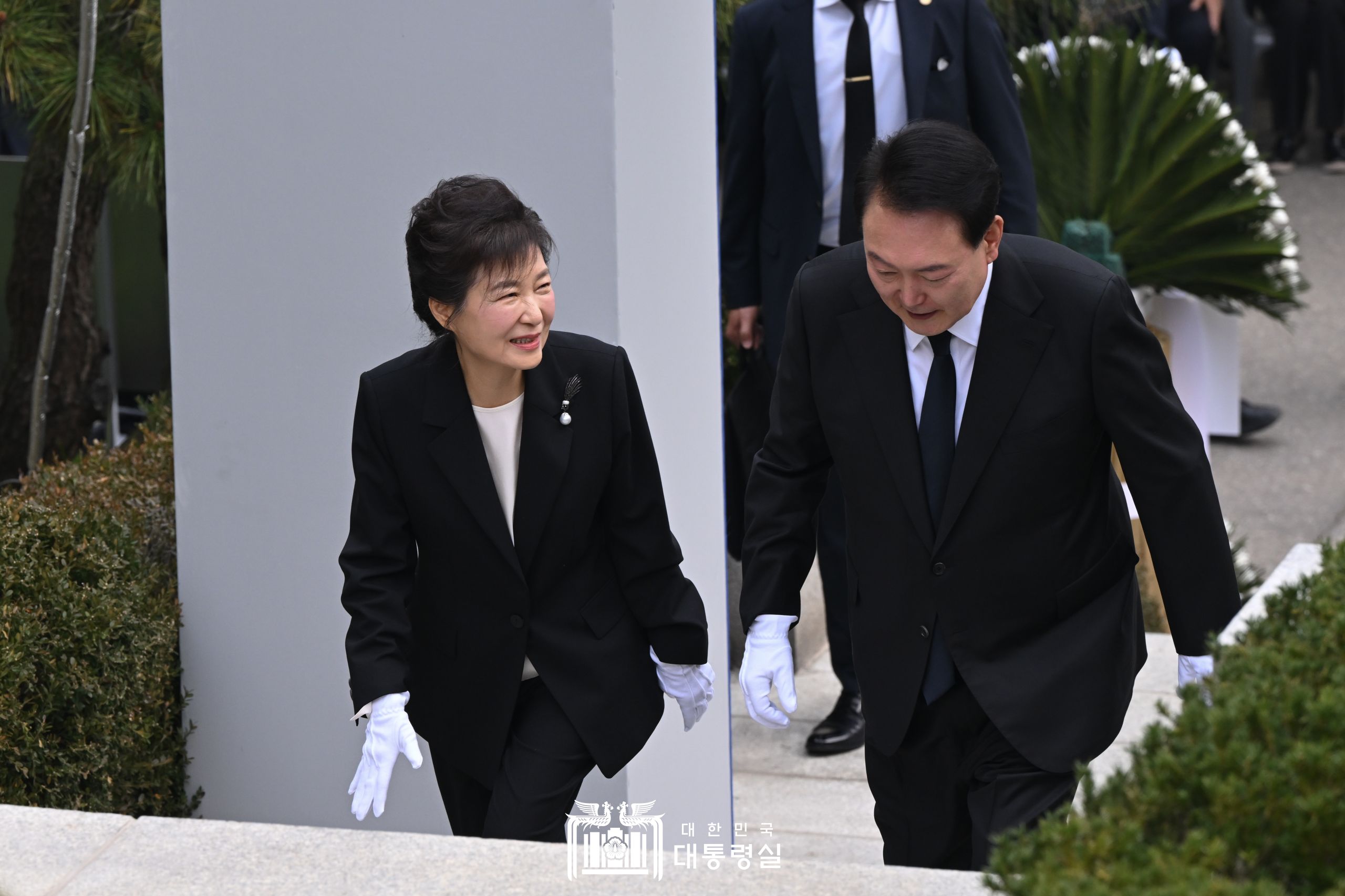 해외 순방을 마치고 돌아온 윤석열 대통령이 10월 26일 국립서울현충원에서 열린 박정희 전 대통령 서거 제44주기 추도식에서 박근혜 전 대통령과 만났습니다.