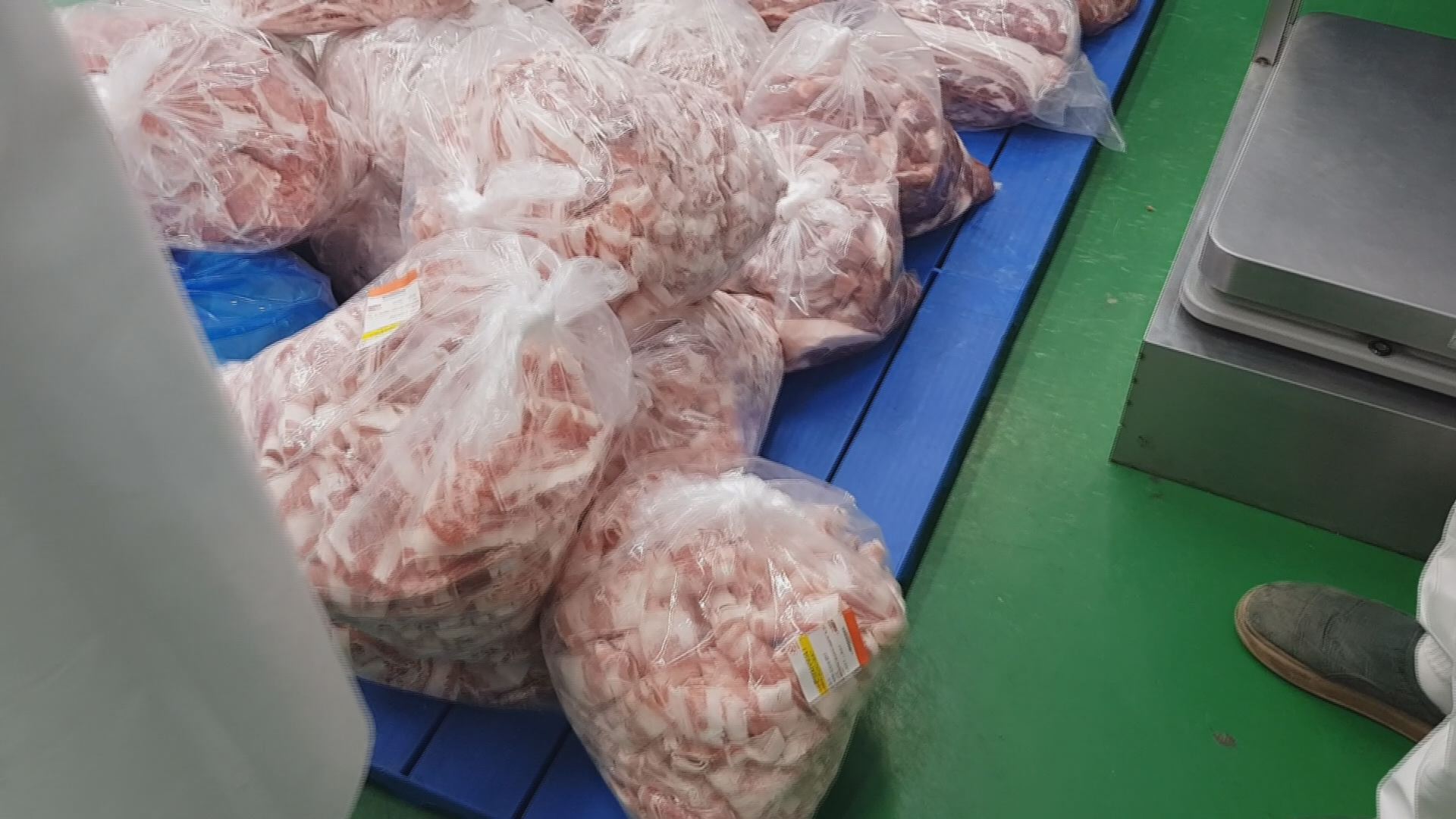 사업장에서는 돼지고기와 소고기를 자르고 포장하는 작업이 한창이고, 창고에는 고기가 잔뜩 쌓여 있습니다.
