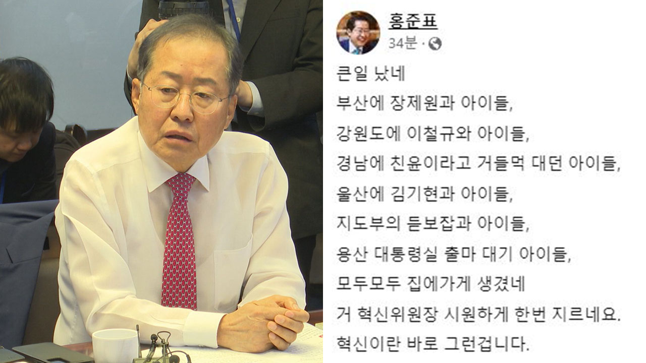 홍 시장은 11월 3일 자신의 SNS에 "혁신위원장이 시원하게 한 번 지르네요"라면서 총선 불출마나 수도권 출마를 해야 할 사람으로 실명을 거론했습니다.