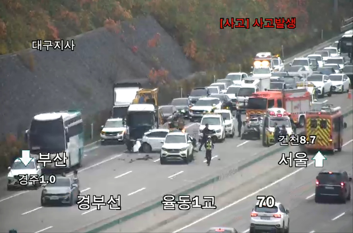 오늘(4일) 낮 12시 19분쯤 경주시 율동 경부고속도로 부산방향 70km 지점에서 화물차와 승용차 등 5중 추돌 사고가 발생했습니다.