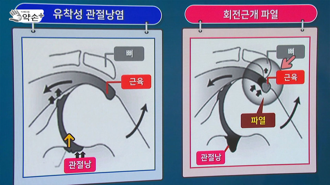 MRI를 보시면 유착성 관절낭염, 관절낭의 밑에 부위가 공간이 좁아져 있고 힘줄은 멀쩡한데요. 회전근개 파열, 힘줄에 공간이 생겼죠? 딸려 갔고 관절낭은 여유가 좀 있습니다. 그래서 회전근개 파열은 힘줄의 파열, 오십견은 관절낭에 염증이 생겨서 좁아진 그런 질병으로 보시면 되겠습니다.