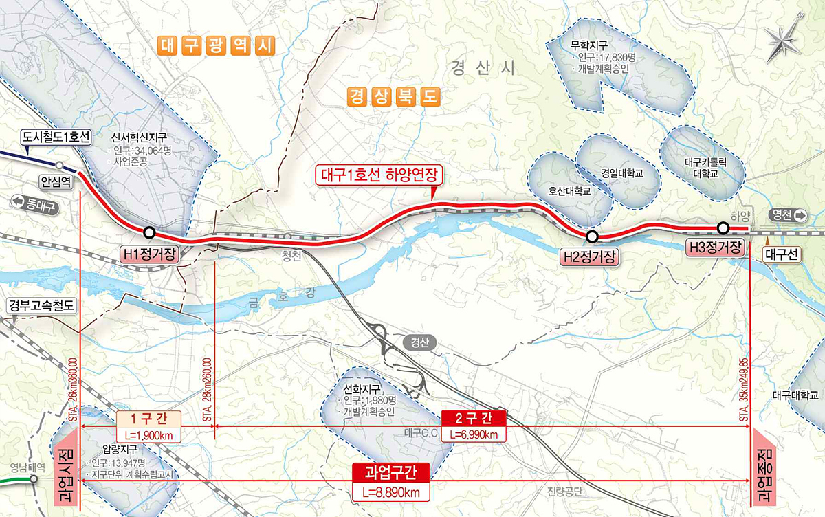 앞서 도시철도 1호선 연장 구간 중 경산에 있는 2개 역은 각각 '부호경일대호산대역', '하양대구가톨릭대역'으로 결정됐습니다.