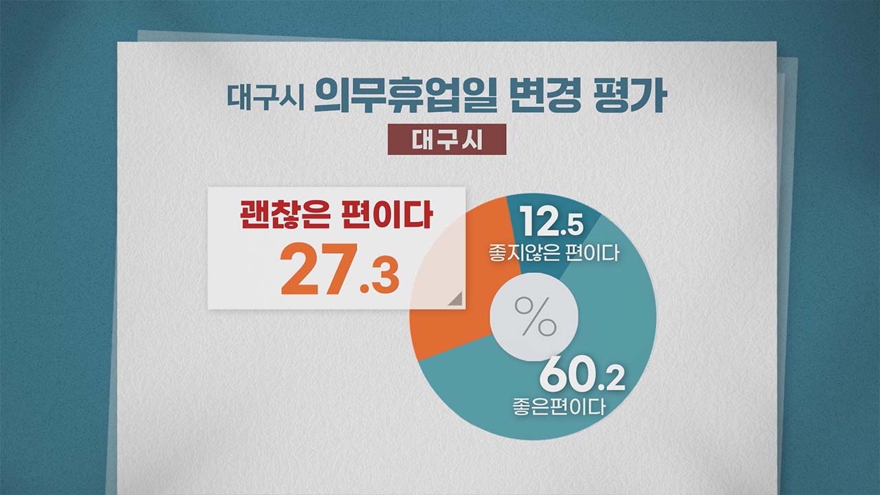 매일신문은 지난 11월 16일 자 기사에서 대구시가 보도자료를 왜곡해 배포했다고 짚었습니다. 조춘한 교수팀이 발표한 자료를 보면, 만족도가 좋다는 시민이 60.2%, 이도 저도 아니다가 27.33%였습니다. 대구시가 보도자료를 낼 때는 '이도 저도 아니다' 27.3%를 '만족한다'에 보태 발표했다는 겁니다. 이렇게 되면 대구시가 의무 휴업일을 잘 바꿨다는 답변이 원래 조춘환 교수의 자료는 60.2%인데 대구시는 87.5%가 됩니다.