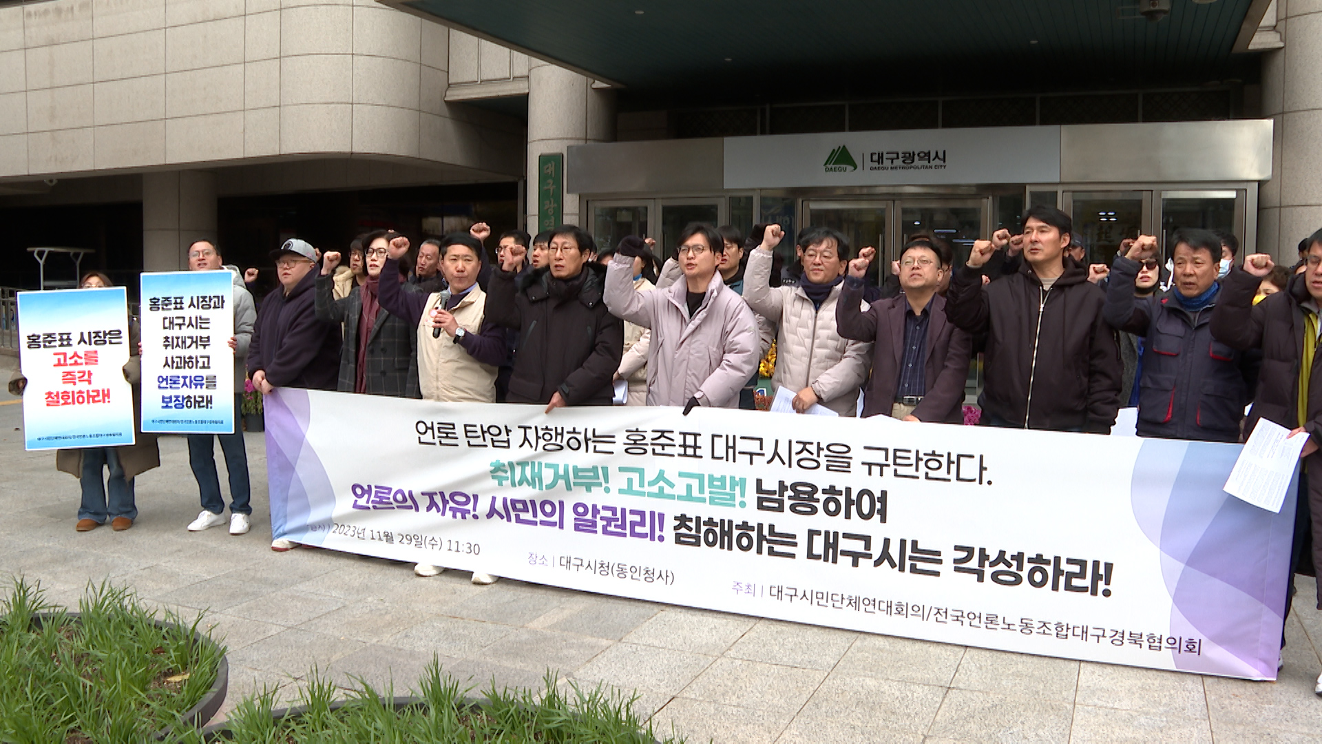 언론노조와 시민단체는 장기간 이어지고 있는 홍준표 시장의 대응에 대구시청 동인 청사 앞에서 기자회견을 열었습니다.