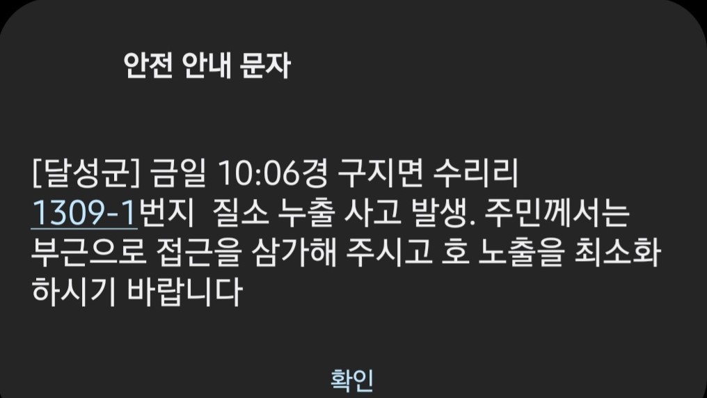 12월 1일 오전 10시 반쯤 대구 달성군은 "10시 06분경 구지면 수리리에서 질소 누출 사고가 발생했다"라며 "부근으로 접근을 삼가라"는 안전 안내 문자를 발송했습니다.