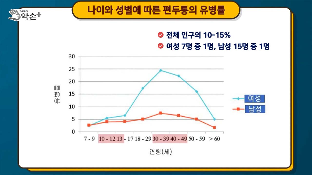 그래서 나이와 성별에 따른 편두통 유병률을 다시 한번 살펴보면 전체 인구 중에 10%~15%. 10%만 잡아도 500만 명이 편두통을 1년 동안에 앓은 경험이 있다는 거죠. 여성은 7명 중의 1명, 남성은 15명 중의 1명입니다. 그런데 이 그림을 보시면 여성, 남성에서 17세부터 60세 이상의 전체 주기에서 편두통의 발생 그래프를 보는 겁니다. 빨간 색깔이 남성입니다. 남녀 차이가 비로소 나타나는 게 초등학교 고학년 12세, 13세. 이때부터 남녀 차이가 드디어 보이기 시작합니다. 그러다가 10대 후반, 20대 초에 완전 남녀 차이가 뚜렷하죠. 가장 정점을 찍는 거는 30~40대죠. 30~40대 여성과 남성은 약 4 대 1로 여성이 압도적입니다. 30~40대 여성이 어떻습니까? 한참 가정 활동, 사회, 육아 활동할 일이 많죠. 애들 학원도 태워줘야 하고 등등이 많은데 이 편두통으로 인해서, 특히 병원에 오는 편두통의 80%, 90%는 여성입니다. 그래서 30~40대 여성 4명이 모이면 한 명이 편두통입니다. 그만큼 편두통은 여성 30~40대, 가볍지 않은 일상생활에 영향을 주는 심각한 만성 뇌 질환입니다. 이거는 뇌 질환입니다. 이 자체가 뇌 질환입니다.