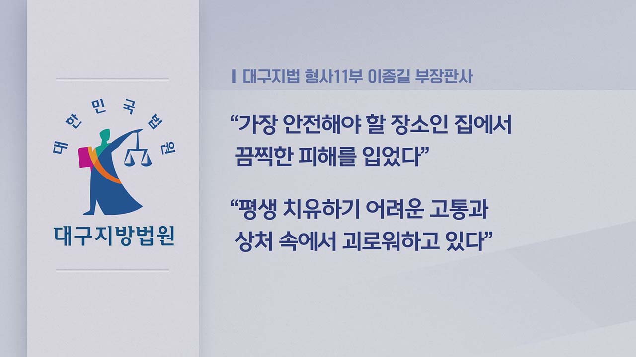이 판사는 "가장 안전해야 할 장소인 집에서 생면부지의 피고인으로부터 끔찍한 피해를 입었다"라며 "평생 치유하기 어려운 고통과 상처 속에서 괴로워하고 있다"라고 밝혔습니다.