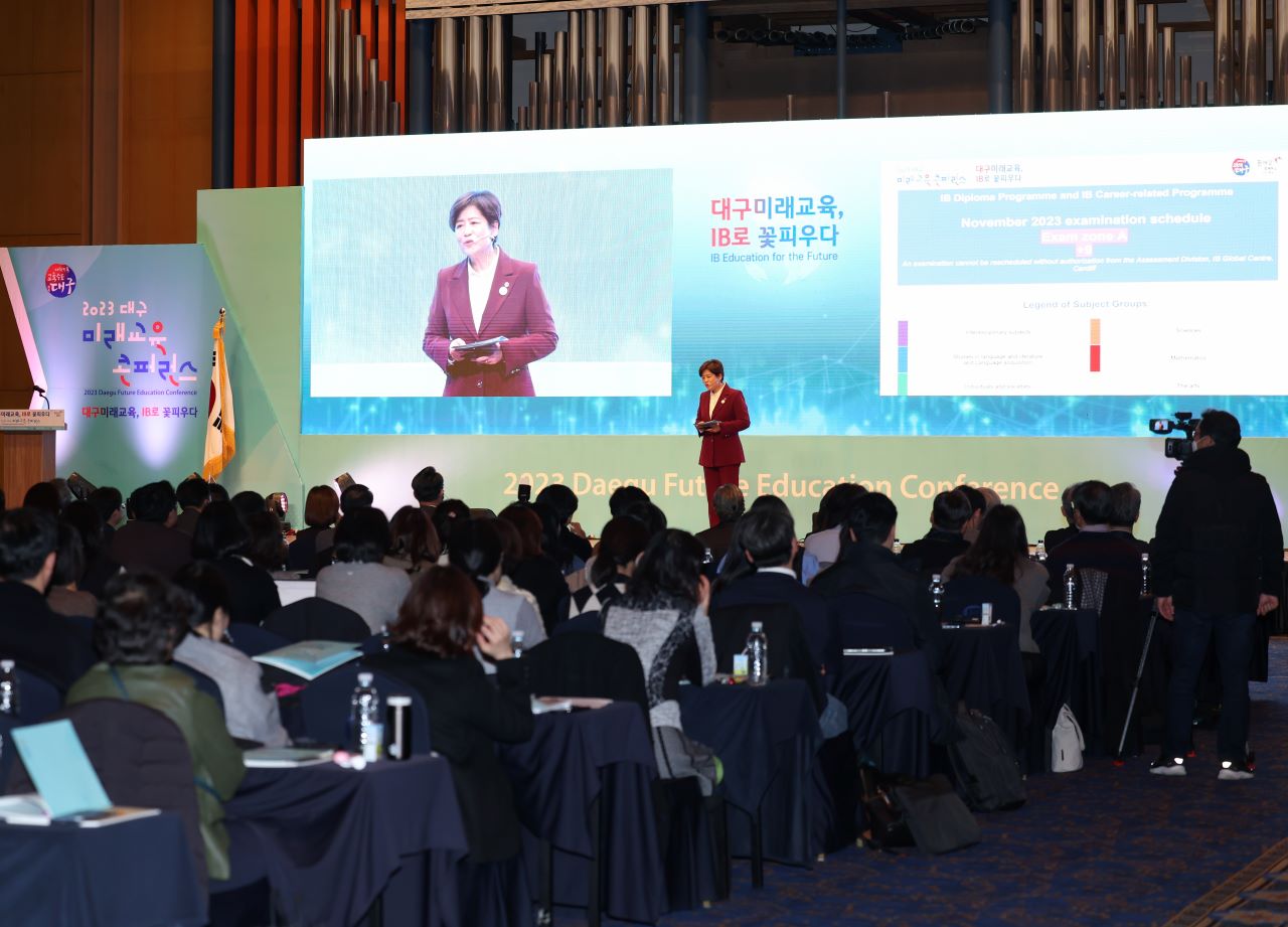 '대구 미래 교육 IB로 꽃피우다'를 주제로 IB 학교 지원본부장인 니콜 비엔 박사가 '교육과정의 미래:교육과정의 적정화'에 관한 개막 연설을 했습니다.