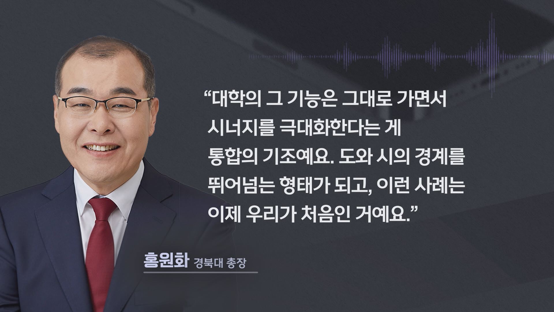 홍원화 경북대 총장은 "대학의 그 기능은 그대로 가면서 시너지를 극대화한다는 게 통합의 기조예요. 도와 시의 경계를 뛰어넘는 형태가 되고, 이런 사례는 우리가 처음인 거예요"라고 덧붙였습니다.