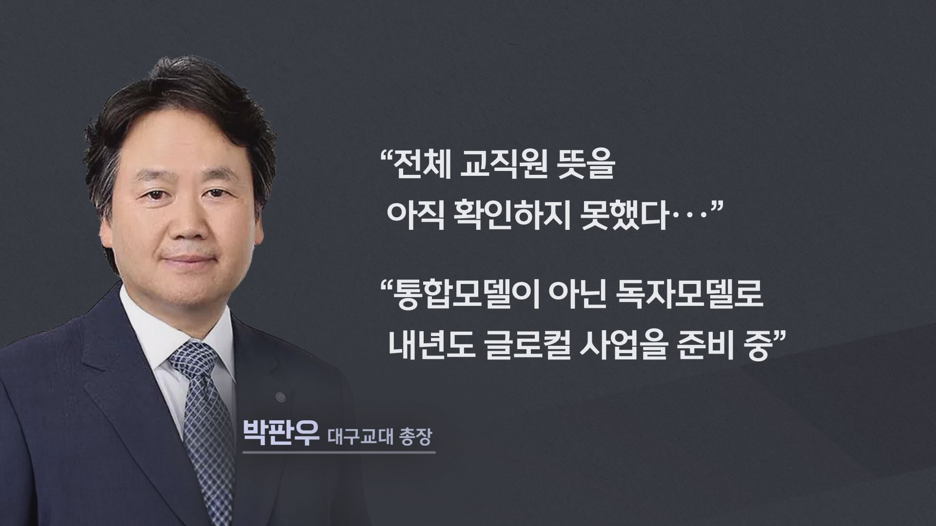 대구교대 박판우 총장은 "경북대로부터 글로컬 사업 공동 제출 제안은 받았지만, 전체 교직원 뜻을 아직 확인하지 못했다"라며 "통합모델이 아닌 독자 모델로 2024년도 글로컬 사업을 준비 중이다"라고 취재진에게 밝혔습니다.