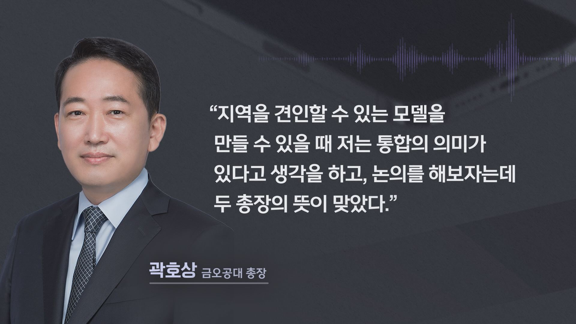 금오공대 곽호상 총장은 "지역을 견인할 수 있는 모델을 만들 수 있을 때 저는 통합의 의미가 있다고 생각하고, 논의를 해보자는데 두 총장의 뜻이 맞았다"라고 말했습니다.