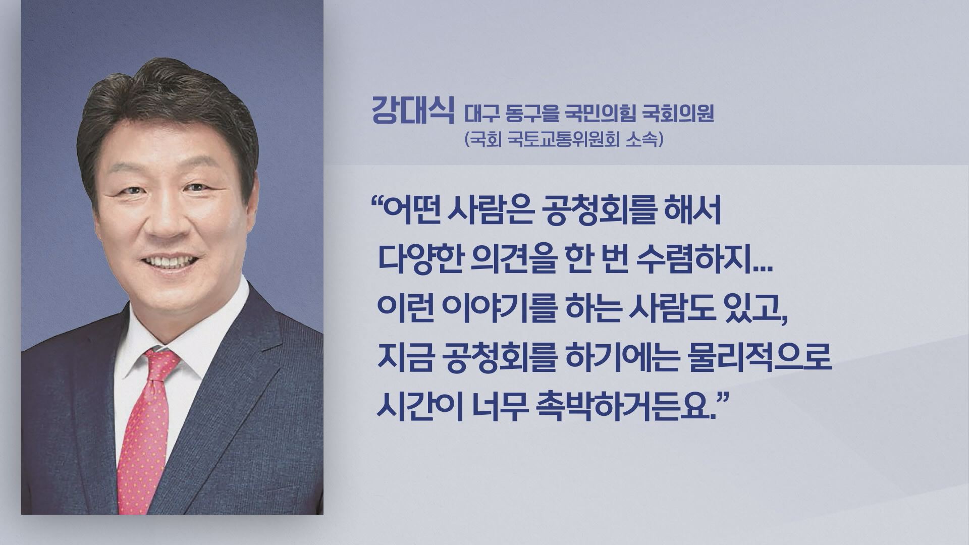 국회 국토교통위원회 소속 강대식 대구 동구 을 국민의힘 국회의원은 "어떤 사람은 공청회를 해서 다양한 의견을 수렴해야 한다는 이야기를 하는 사람도 있었다"라며 "지금 공청회를 하기에는 물리적으로 시간이 너무 촉박하다"라고 밝혔습니다.