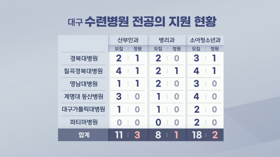 18명을 뽑는 소아청소년과의 경우, 경북대병원과 칠곡경북대병원에만 각각 한 명씩 지원했을 뿐 나머지 4개 병원에는 단 한 명도 지원하지 않았습니다.