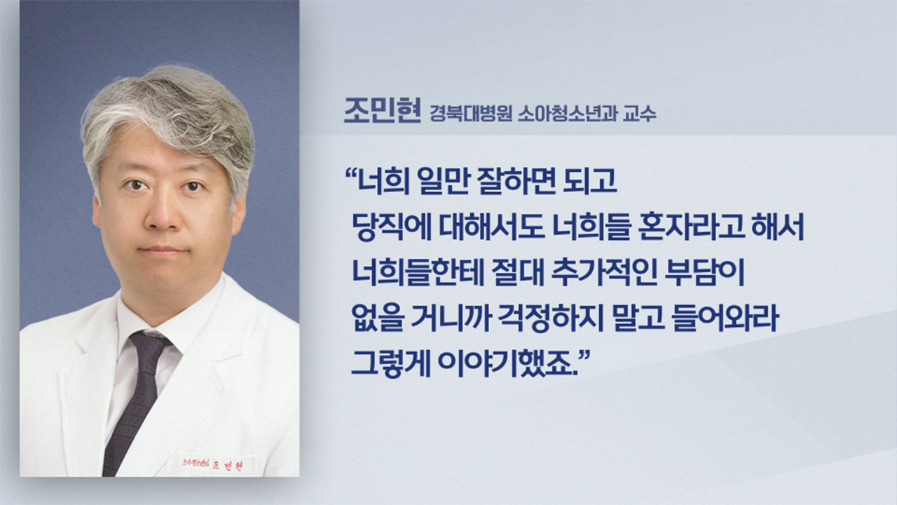 조민현 경북대병원 소아청소년과 교수는 전공의 지원을 앞둔 학생들에게 "전공의 선배가 없고 이런 부담이 되는 부분에 대해서 전혀 너희 학생들한테 추가 부담이 없고 너희 일만 잘하면 되고 당직에 대해서도 너희들 혼자라고 해서 너희들한테 절대 추가적인 부담이 없을 거니까 걱정하지 말고 들어와라 그렇게 이야기했죠."라면서 전공의가 부족한 부분을 기존의 교수진들, 즉 대학병원의 의사들이 메워주겠다고 약속했다고 합니다.