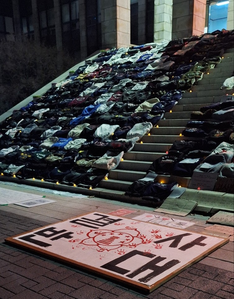 경북대 본관 건물 앞 계단에는 통합을 반대하는 학생들의 학과 점퍼로 가득 찼고, 계단 양옆에는 근조화환까지 놓였습니다.