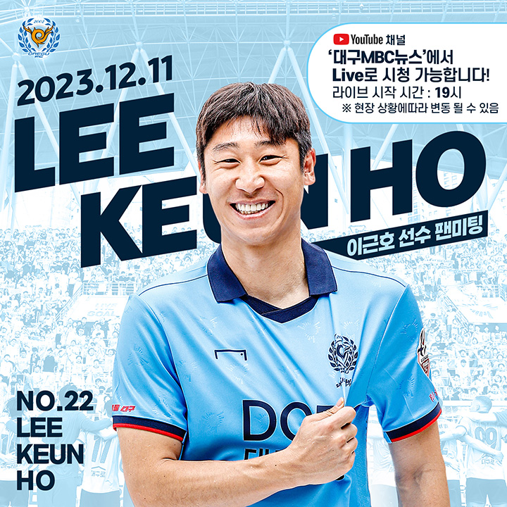 12월 11일 저녁 7시부터 대구미술관 내 카페에서 지난달 미리 사전 신청한 22개 팀 40여 명의 팬과 구단 관계자가 함께하는 이번 팬 미팅은 이근호 선수의 토크 콘서트와 사인회, 애장품 추첨 증정 이벤트 등이 함께 할 예정입니다.