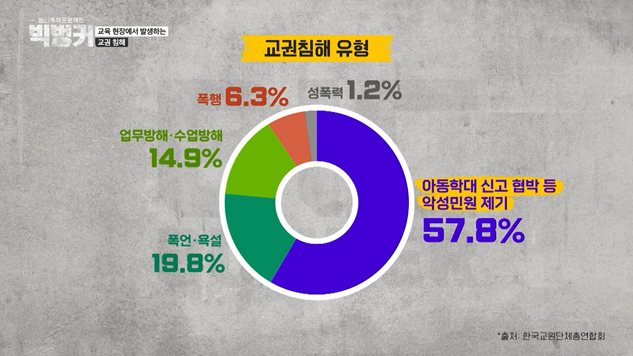 실제로 교총이 2023년 7월 25일~26일, 만 하루 동안 피해 사례를 접수한 결과 총 1만 1,628건 중 학부모의 교권 침해(8,344건)가 학생(3,284건)보다 두 배 이상이 될 정도로 많은 비중을 차지했습니다.