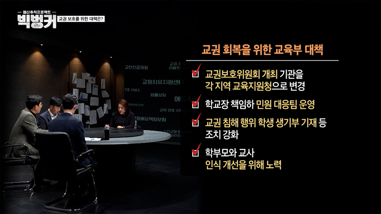 컨트롤 타워인 정부에서는 어떻게 하고 있을까요? 교육부가 내놓은 대책을 보면 교권보호위원회 운영 신뢰성을 높이기 위해 원래는 학교에서 열었던 교권보호위원회를 각 지역 교육지원청에서 열기로 했고, 학교장 책임 하의 민원 대응팀이 학부모 민원을 대응할 수 있게 제도를 마련했습니다. 그리고 교권 침해 행위 학생에게 생기부 기재 등 조치를 강화하고 학부모와 교사의 인식 개선을 위해서도 노력해 나가겠다고 밝혔습니다.