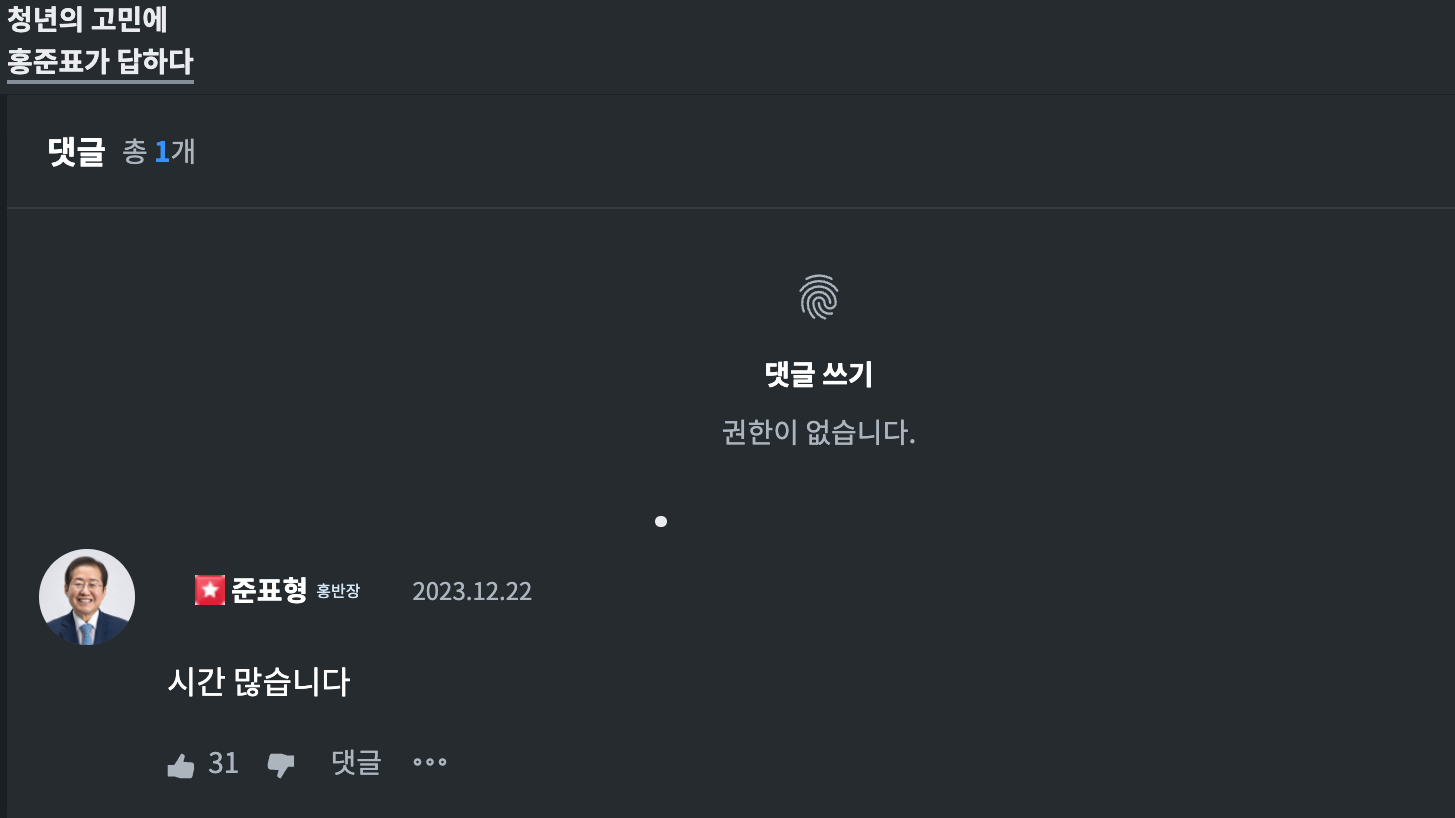질문자는 "한동훈 비대위로 들어서면서 벌써부터 정치적 스포트라이트가 이준석, 한동훈 중심으로 쏟아지고 있는 와중에 더군다나 준표 형까지 페이스북에 입장 표명을 안 하겠다고 하셨으니 국민들한테 준표 형 입지가 좁아질까 걱정이 되긴 하네요"라고 썼습니다.
