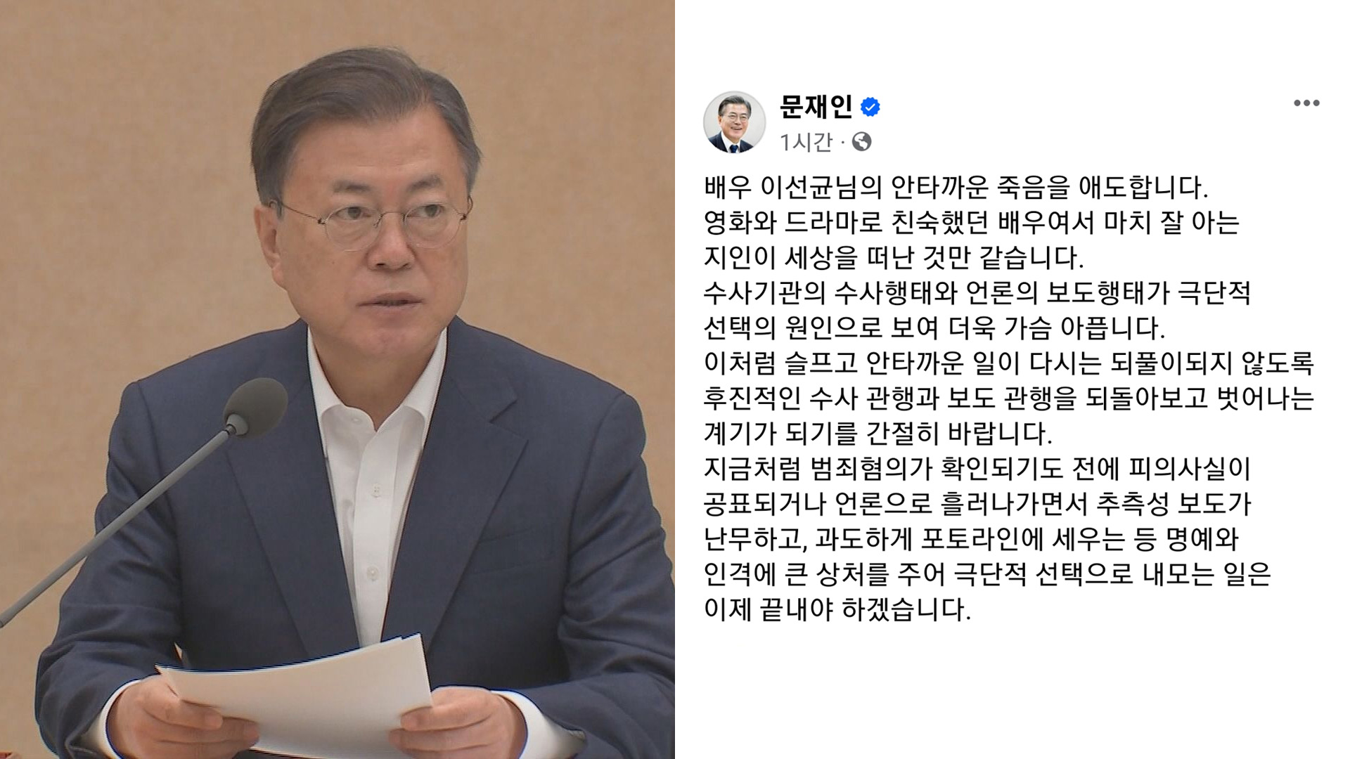 문재인 전 대통령이 "배우 이선균 씨의 죽음이 수사기관의 수사행태와 언론의 보도 행태가 극단적 선택의 원인으로 보여 더욱 가슴이 아프다"고 밝혔습니다.