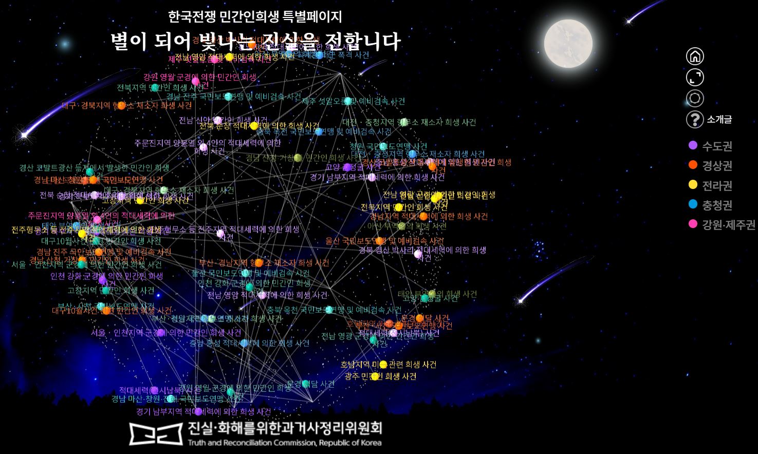 '별이 되어 빛나는 진실을 전합니다' 제목의 특별페이지에는 한국전쟁 전후 군·경에 의한 민간인 희생 사건, 적대세력에 의한 희생 사건, 국민보도연맹 및 예비검속 사건, 미군 폭격 사건, 교도소‧재소자 희생 사건, 부역 혐의 사건 조사보고서를 토대로 한 스토리 텔링형 콘텐츠 37건이 담겨 있습니다.