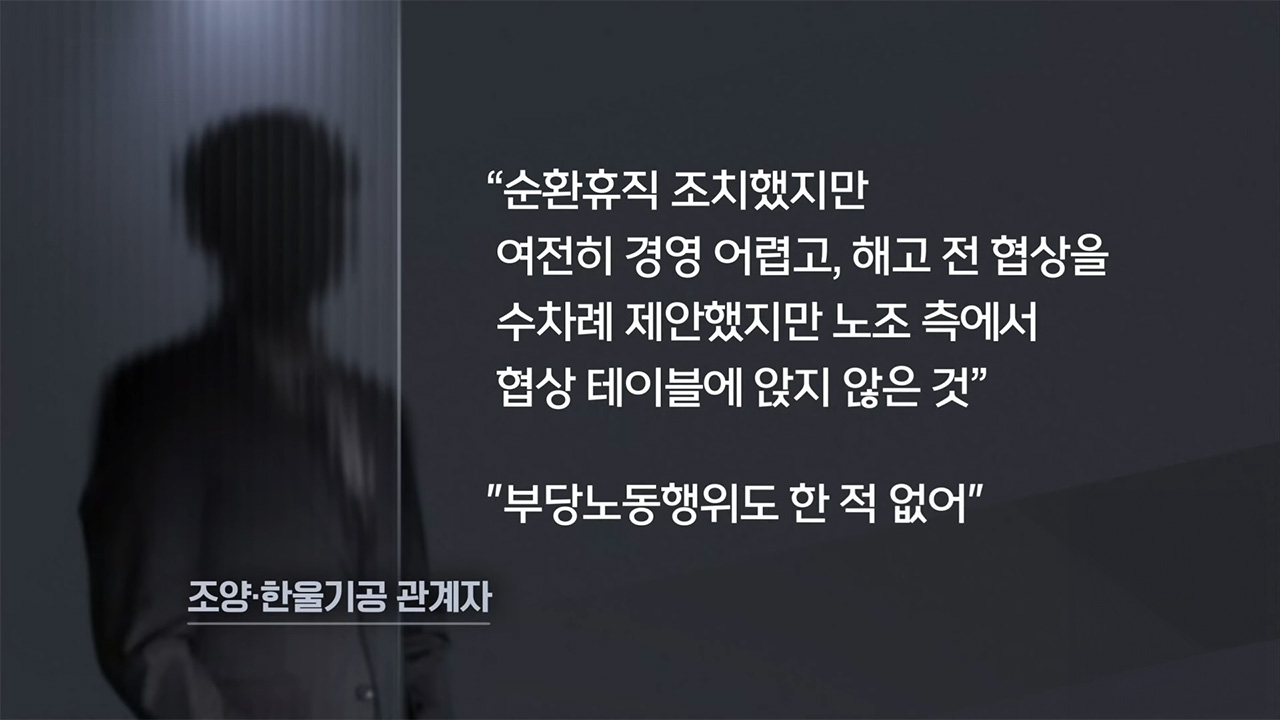 손기백 조양·한울 노조 분회장, 해고 노동자 "노동조합에서는 회사가 점점 이렇게 더 파행으로 가서 파국으로 가는 것보다는 우리가 회사를 지키자고 해서 파업을 종료하고 회사 측에 종료를 요청하고 정상적인 업무 수행을 하자고 했는데 회사에서는 저희가 파업을 종료한 이후에도 일주일 동안 직장 폐쇄를 유지를 했었습니다."