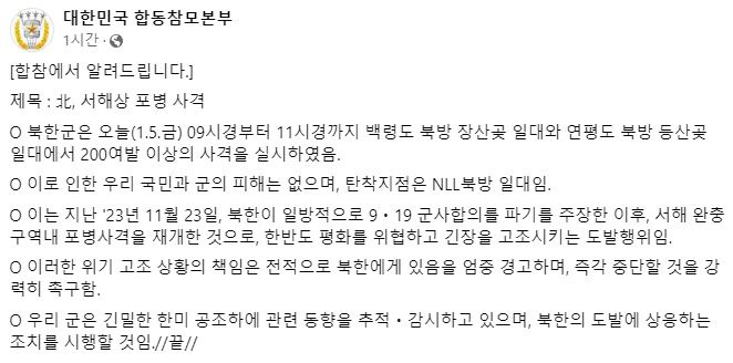 이성준 합동참모본부 공보실장은 1월 5일 오후 긴급 기자회견에서 "북한군은 오늘 오전 9시경부터 11시경까지 백령도 북방 장산곶 일대와 연평도 북방 등산곶 일대에서 200발 이상의 사격을 실시했다"고 밝혔습니다.